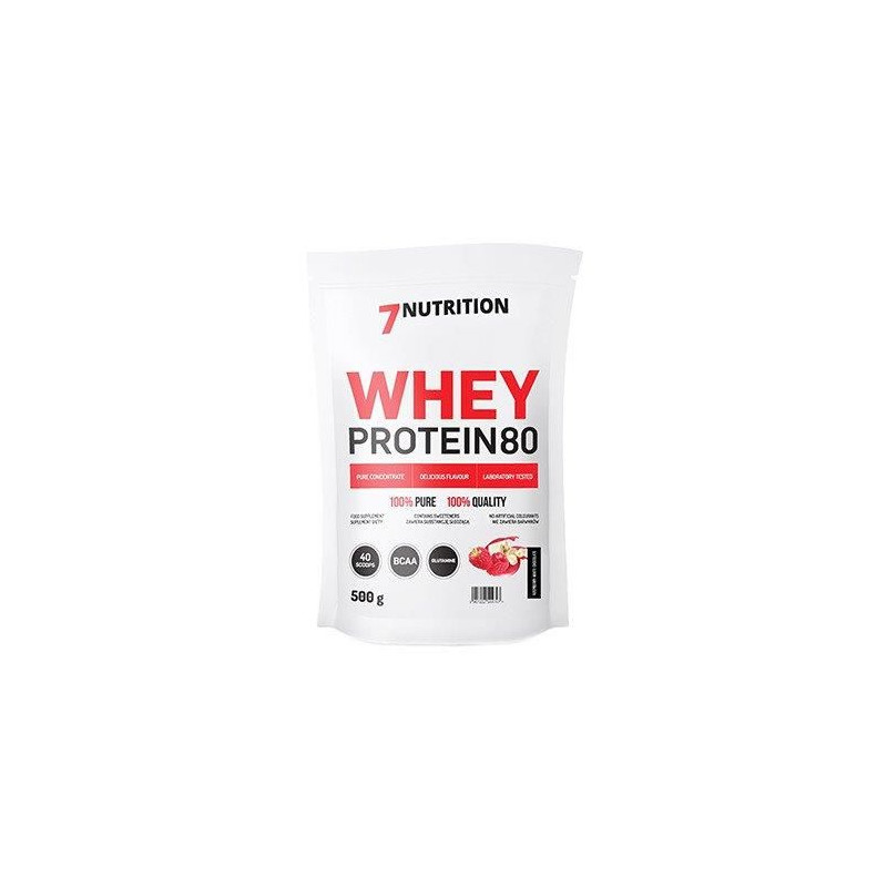 7Nutrition Whey Protein 80 vysokoproteínový kondicionér na báze vysokokvalitného srvátkového proteínového koncentrátu. Výrobok je vhodný pri redukčnej diéte, pretože obsahuje málo cukru. Doplnok bol získaný v procese ultrafiltrácie. Odporúča sa najmä pre ľudí, ktorí chcú rýchlo zvýšiť svalovú hmotu a silu. Bohaté zloženie aminokyselín zabezpečuje nielen účinné anabolické, ale aj antikatabolické procesy. Veľkosť porcie: 35g